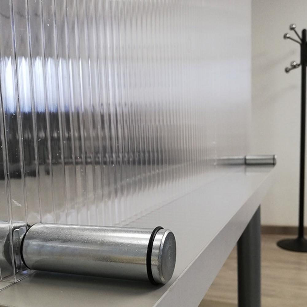 - Sistema de sujeción seguro: permite fijar mamparas de metacrilato, policarbonato, vidrio templado u otros materiales de forma rápida y fiable.